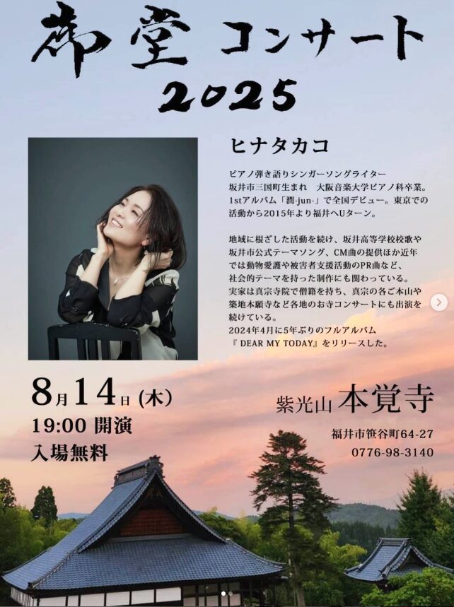 3年目となります、福井市笹谷町の本覚寺さまでの御堂コンサート。 山間の丘に立つ見晴らしの良いお寺にて 亡き人を偲ぶお盆の宵に、命をテーマにした楽曲たちを弾き語りでお届けいたします。 地元の子どもたちも合唱で参加してくれます。入場無料です。 御堂コンサート2025 日時 8月14日(木)19時〜 ご住職のお勤め後ライブとなります。 会場 真宗山元派 本覚寺 福井市笹谷町64-27 入場無料 お賽銭のご協力をお願いします